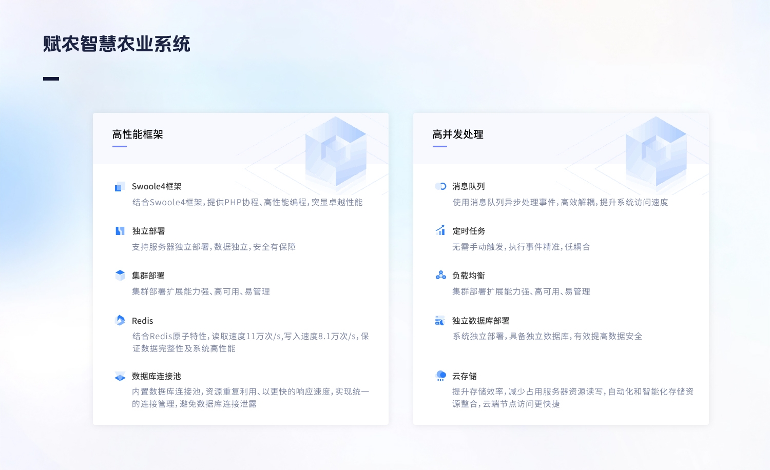 赋农系统依托Swoole4协程框架+Redis缓存+云原生架构,构建高并发、高可用的农业操作系统: