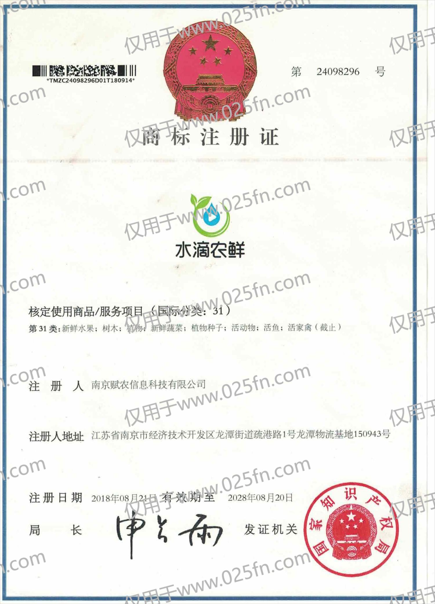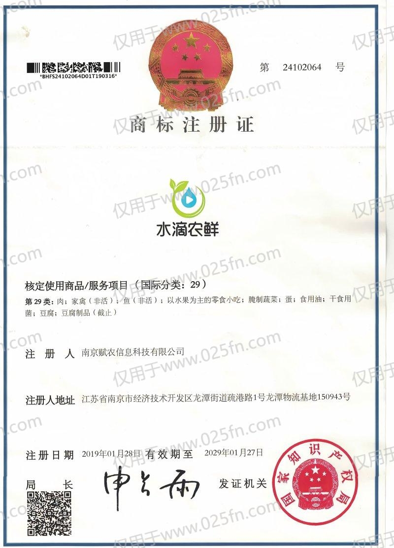在智慧农业领域持续创新突破、知识产权保护体系日臻完善的南京赋农信息科技有限公司,迎来品牌建设重要里程碑。2019 年 1 月 28 日,公司正式取得国家知识产权局颁发的【水滴农鲜】图形 + 文字商标注册证,成功覆盖第 29 类(肉蛋奶制品)、第 30 类(米面粮油等食品)两大民生刚需品类,商标注册证号分别为 24102064 号、24098296 号。此次高含金量的商标确权,不仅标志着企业品牌资产的重磅升级,更为智慧农业产业数字化转型注入全新动能。
