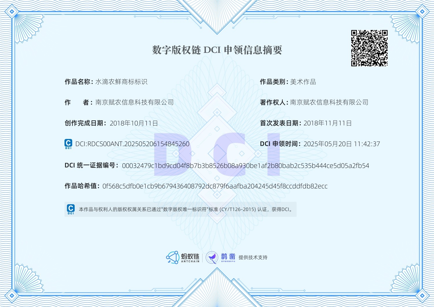 数字版权链DCI证书-水滴农鲜商标标识